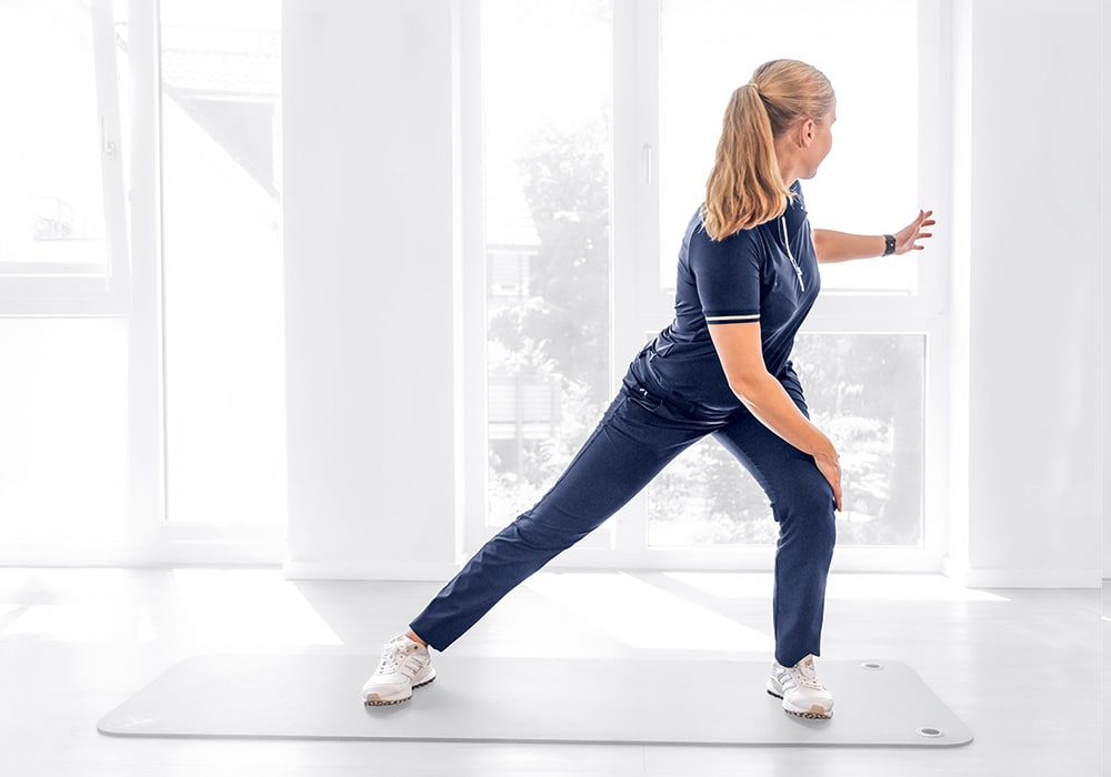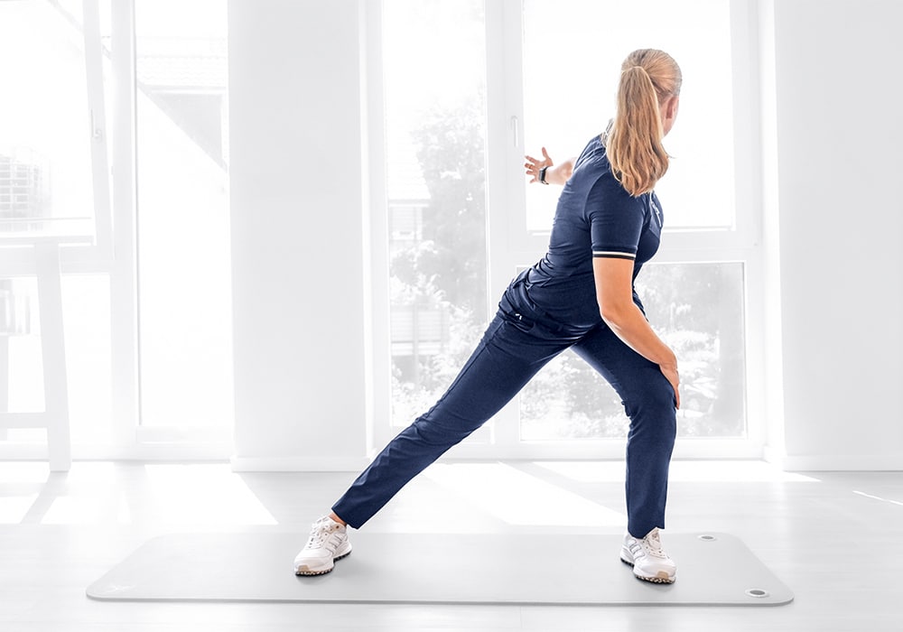 So geht’s: Diese Übung kombiniert Beinkraft und Rumpfstabilität: Aus einem breiten Stand wird ein tiefer Seitwärts-Ausfallschritt gemacht, während der Oberkörper samt Armen kontrolliert zur Seite rotiert. Danach zurück zur Mitte und auf die andere Seite wechseln. Die diagonale Bewegung fordert Beinmuskulatur, Core und Koordination gleichermaßen – perfekt für eine stabile Basis im Golfschwung.