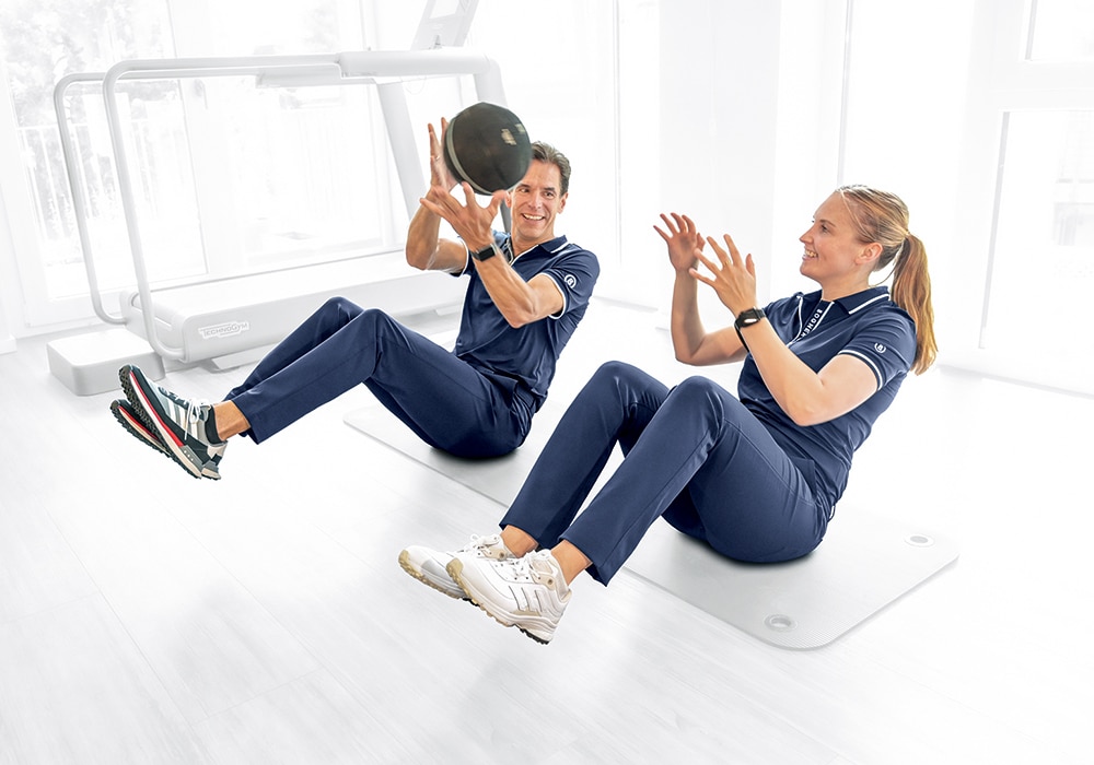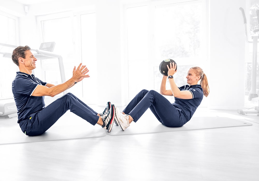 So geht’s: perfektes Core-Training im Team: Beide Partner liegen sich gegenüber. Einer führt einen Sit-up aus und wirft den Medizinball zum Partner, der den Ball fängt, kontrolliert abrollt und den Bewegungsablauf wiederholt. Die Übung aktiviert Bauch- und Hüftbeuger intensiv und schult gleichzeitig Koordination und Timing.
