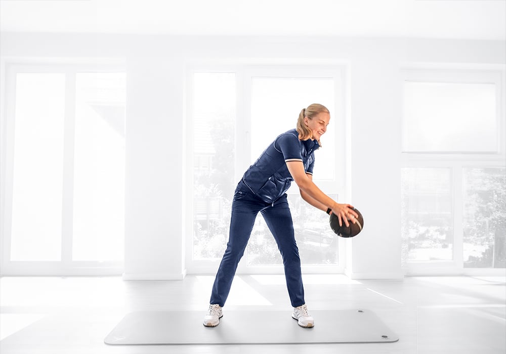 So geht’s: Hier trifft Core-Training auf Golfspezifik: In Rückenlage wird der Medizinball über der Brust gehalten. Aus dieser Position den Oberkörper kraftvoll aufrichten und den Ball stabil nach oben führen. Die Bewegung wird kontrolliert und ohne Schwung ausgeführt – maximale Aktivierung der tiefen Bauchmuskulatur ist garantiert.
